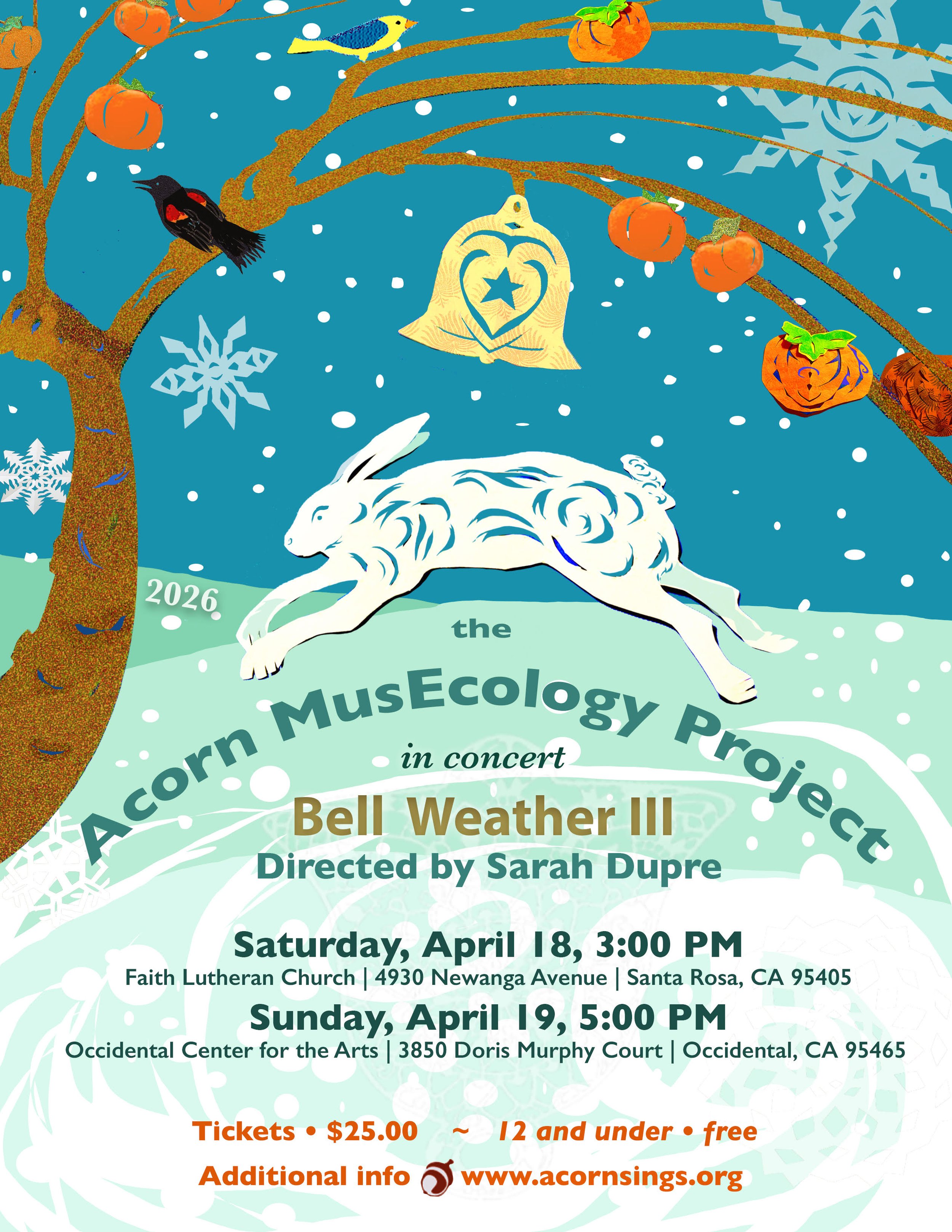 Please join The Acorn MusEcology Project for BELL WEATHER III, a poignant hour-long program of compelling and uplifting music. Directed by Sarah Dupre, the 24 members of the Acorn MusEcology Project choral ensemble continue to create and share music that explores our collective role as caretakers in our relationship with the Earth––with our animal and plant brethren and living systems—toward the rediscovery, healing, and reimagining of a vibrant planet beyond our own time.