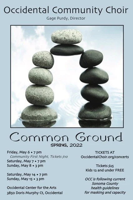 Born around a bonfire in Occidental in the winter of 1978, OCC is thrilled to emerge from the recent darkness to present an exciting Spring 2022 concert series titled Common Ground . Under the inspired direction of Gage Purdy, we offer a unique blend of original compositions and contemporary and classical songs from outside composers, plus some poetry and theatrics, to highlight themes that unite us all; including caring for an aging parent, social and political justice, environmental warriors, personal responsibility, airport security announcements, the tragic diaspora of refugees... even raccoons! And you won’t want to miss our unique rendition of Smash Mouth’s ‘All Star’ as an English madrigal! All concerts will be held at Occidental Center for the Arts, following current Sonoma County public health guidelines. Tickets are $25 . Kids 12 and under FREE.