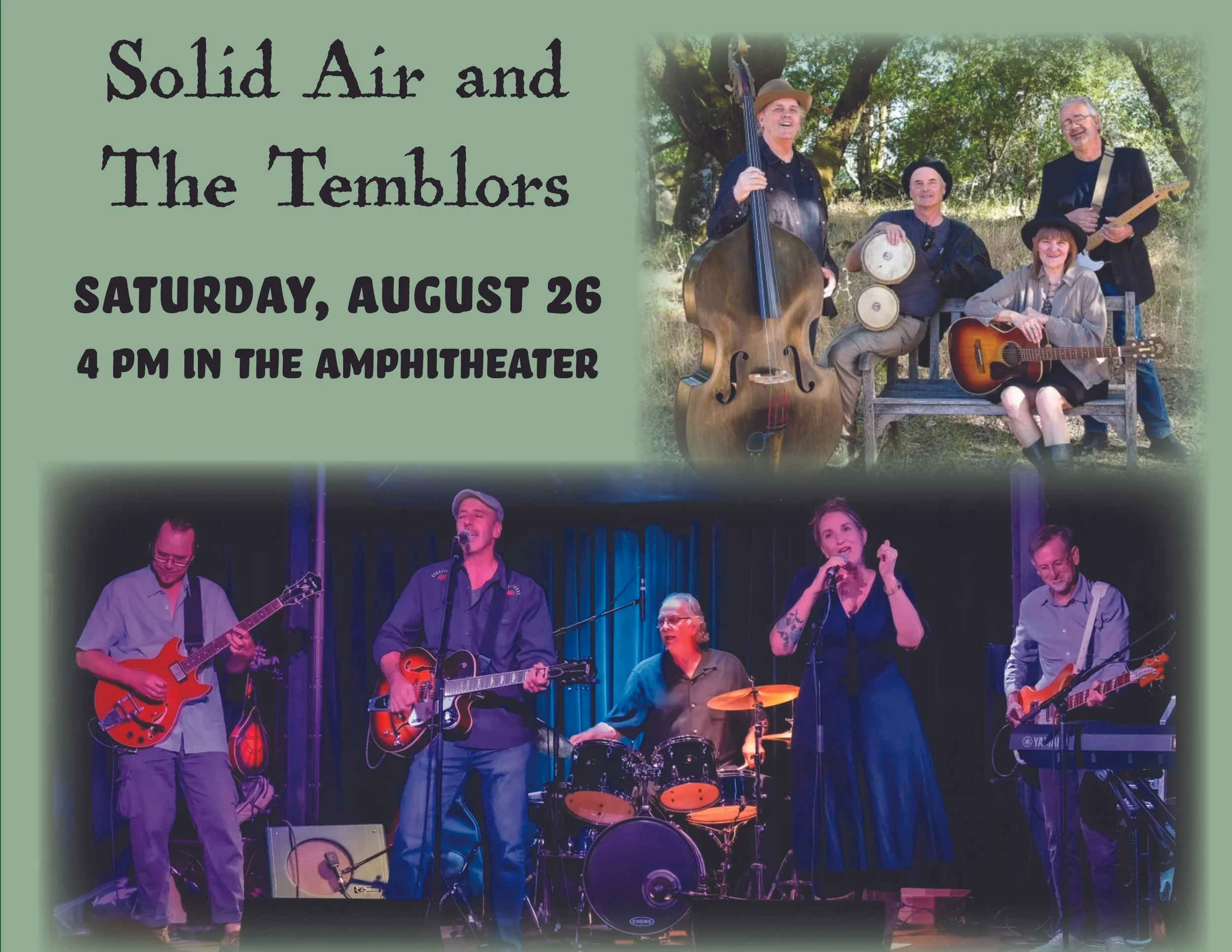 Don't miss this fantastic double-bill with some of Sonoma County's most talented musicians! Solid Air Band and The Temblors will present a variety of Americana covers and originals for our musical pleasure. Performed in our amphitheater, this show is sure to lift your spirits and get your toes tapping!